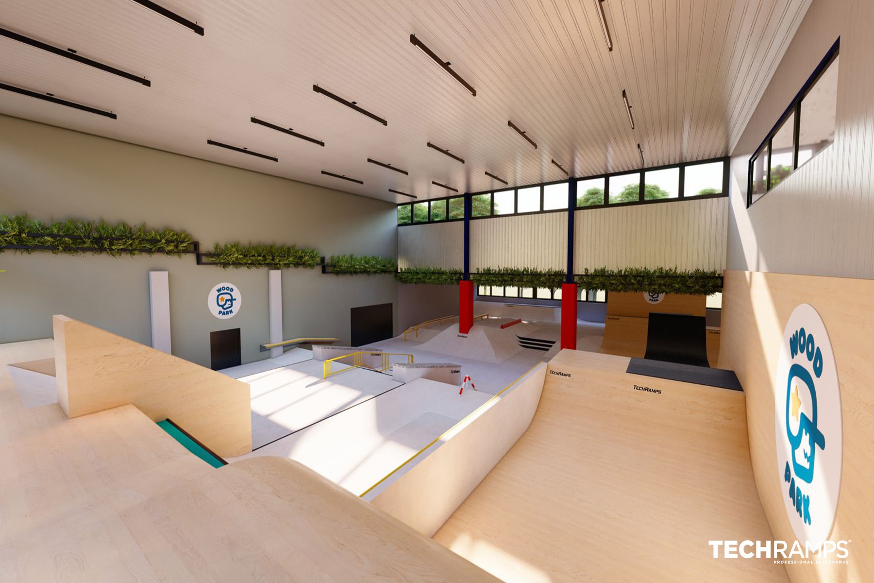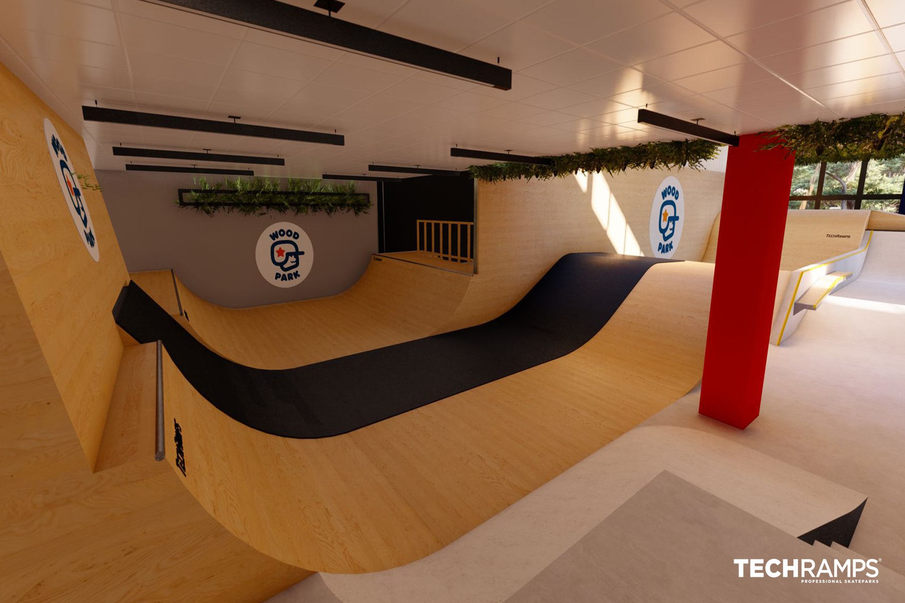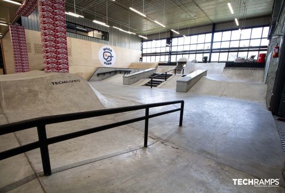 Skatepark Woodpark is the first indoor concrete skatepark in Poland. Skatepark consists of two sections which are: