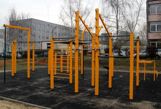 The kit includes standard rods of various widths and heights, vertical and horizontal ladder and atypical elements such as gymnastic rings, plyobox or high pole for pole dance.